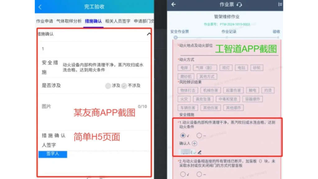 電子作業(yè)票系統(tǒng)主要在作業(yè)現(xiàn)場使用,需滿足不同層次人員的使用需求,交互體驗至關(guān)重要。在繁忙多變的作業(yè)環(huán)境中,工作人員需要迅速、準(zhǔn)確地操作電子作業(yè)票系統(tǒng),以保障工作安全高效開展。若僅關(guān)注系統(tǒng)復(fù)雜功能和強(qiáng)大能力,可能導(dǎo)致實際使用困難,成為基層員工的負(fù)擔(dān)。工智道在 APP 端投入大量資源,根據(jù)基層員工的工作場景和習(xí)慣進(jìn)行針對性交互設(shè)計。比如,采用清晰、舒適且易于區(qū)分的顏色組合,避免視覺疲勞和混淆,確保長時間使用仍有良好視覺感知;精心設(shè)計自定義交互組件,讓填寫作業(yè)票信息、查看相關(guān)流程和規(guī)范等操作更便捷、直觀;運用原生開發(fā) APP 緩存機(jī)制,應(yīng)對作業(yè)現(xiàn)場可能出現(xiàn)的網(wǎng)絡(luò)不穩(wěn)定問題,即便網(wǎng)絡(luò)斷開,員工也能繼續(xù)必要操作,不會因網(wǎng)絡(luò)問題耽誤工作。這也是工智道選擇成本更高的原生開發(fā) APP,而非成本更低的普通 H5 類型 APP 的重要原因。普通 H5 的 APP 在性能、用戶體驗和適應(yīng)性方面存在局限,難以滿足作業(yè)現(xiàn)場復(fù)雜多變的需求。為實現(xiàn)這些交互體驗和流暢操作,工智道近十年來投入了大量努力和資源。