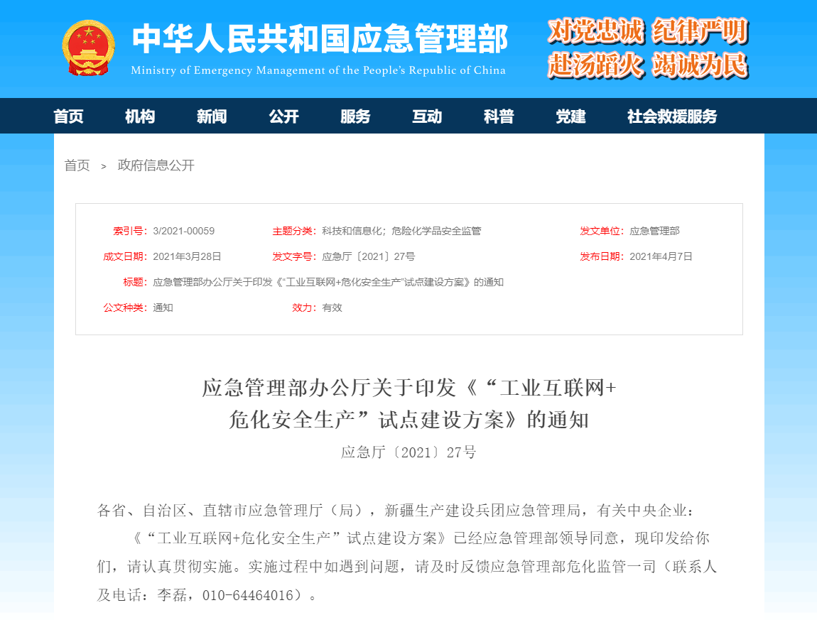 4月7日,國(guó)家應(yīng)急管理部官網(wǎng)正式對(duì)外印發(fā)《“工業(yè)互聯(lián)網(wǎng)+?;踩a(chǎn)”試點(diǎn)建設(shè)方案》。