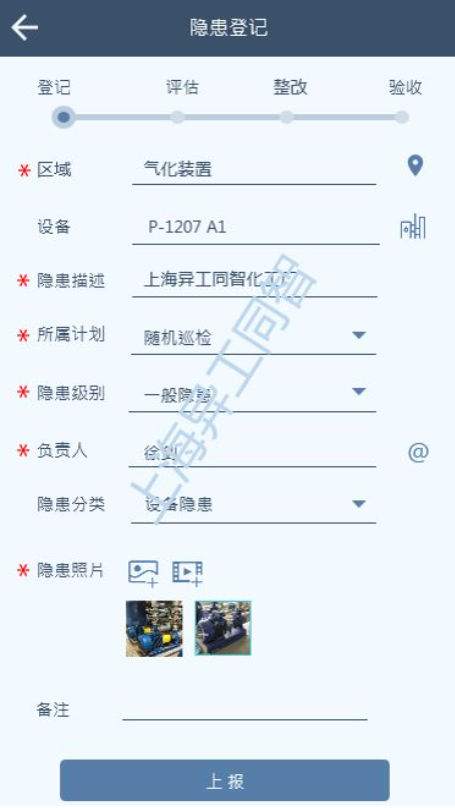 隱患登記:隱患排查過程中發(fā)現(xiàn)隱患,可以隨時(shí)通過移動(dòng)終端進(jìn)行隱患上報(bào),保證隱患信息未經(jīng)處理全部來自現(xiàn)場(chǎng);